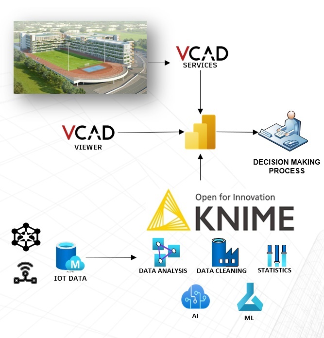 Vcad è lo strumento che gestisce e visualizza i dati provenienti dai modelli BIM, creando un ambiente interattivo che permette ai decisori di trarre informazioni utili dall’integrazione tra BIM e sensori IoT.